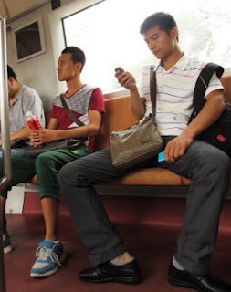El complemento estrelar entre los hombres es el bolso. Ellos llevan bolso y encima y por lo que he visto y oido, los hombres también se supone que han de cargar el bolso de sus parejas…También por supuesto el smartphone y los ordenadores, eso que no falte, te los ves en restaurantes, metro, cafeterias y hasta en la calle, miren esta foto que capté saliendo de casa……